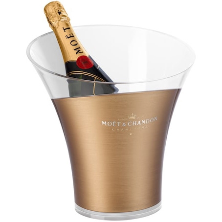 A sophisticated champagne cooler made of transparent acrylic material in the distinctive Moët design with a brushed gold effect, designed to chill and maintain the temperature of a champagne bottle.